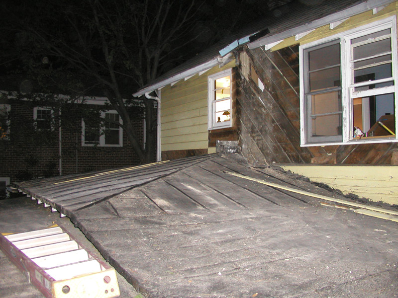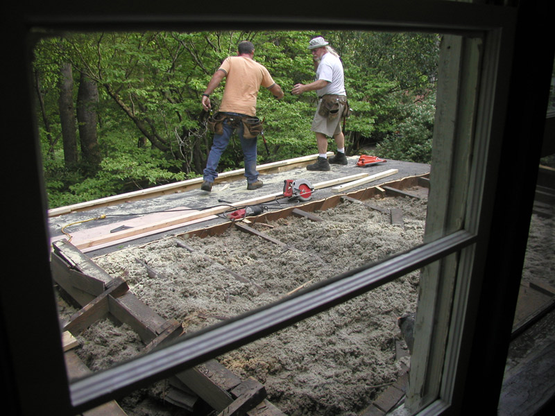 The roof over the kitchen and master bedroom–the only single story part of the house–was deemed a lost cause and a bizarre plan was hatched: to saw off the uppermost portion of the old roof, and then build a new, steeper roof on top of it. Here you can see “Sonny” and “Little Sonny” in process. They’ve removed the top portion of the old roof, revealing the old rock wool insulation within.