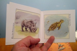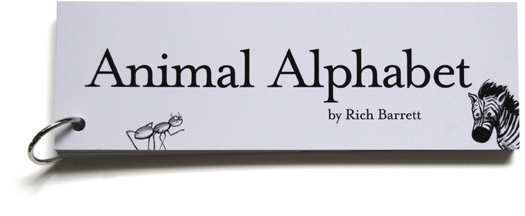 All 26 of Rich Barrett’s Animal Alphabet illustrations–one to a page and bound together with a metal clip ring.