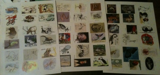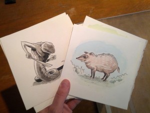 To make these amazing Animal Alphabet postcard sets, Issac selected some of the best artwork from many different contributors to the original Animal Alphabet project and put the whole project on Kickstarter. The original project goal was a modest $750.00, but it completed successfully with many times that: $3384.00. Isaac’s using all that extra cash to make these really top-notch production-wise: high quality glossy stock, beautifully-designed belly bands, etc.