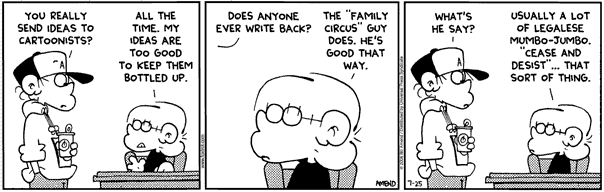 These two Foxtrot strips were published a few weeks apart, but I wonder if they’re related—and indicative of some real life response to the Sunday strip from the Bill Keane/Family Circus empire. (Especially possible, given the differing lead times cartoonists have to adhere to for daily vs. Sunday strips.)
