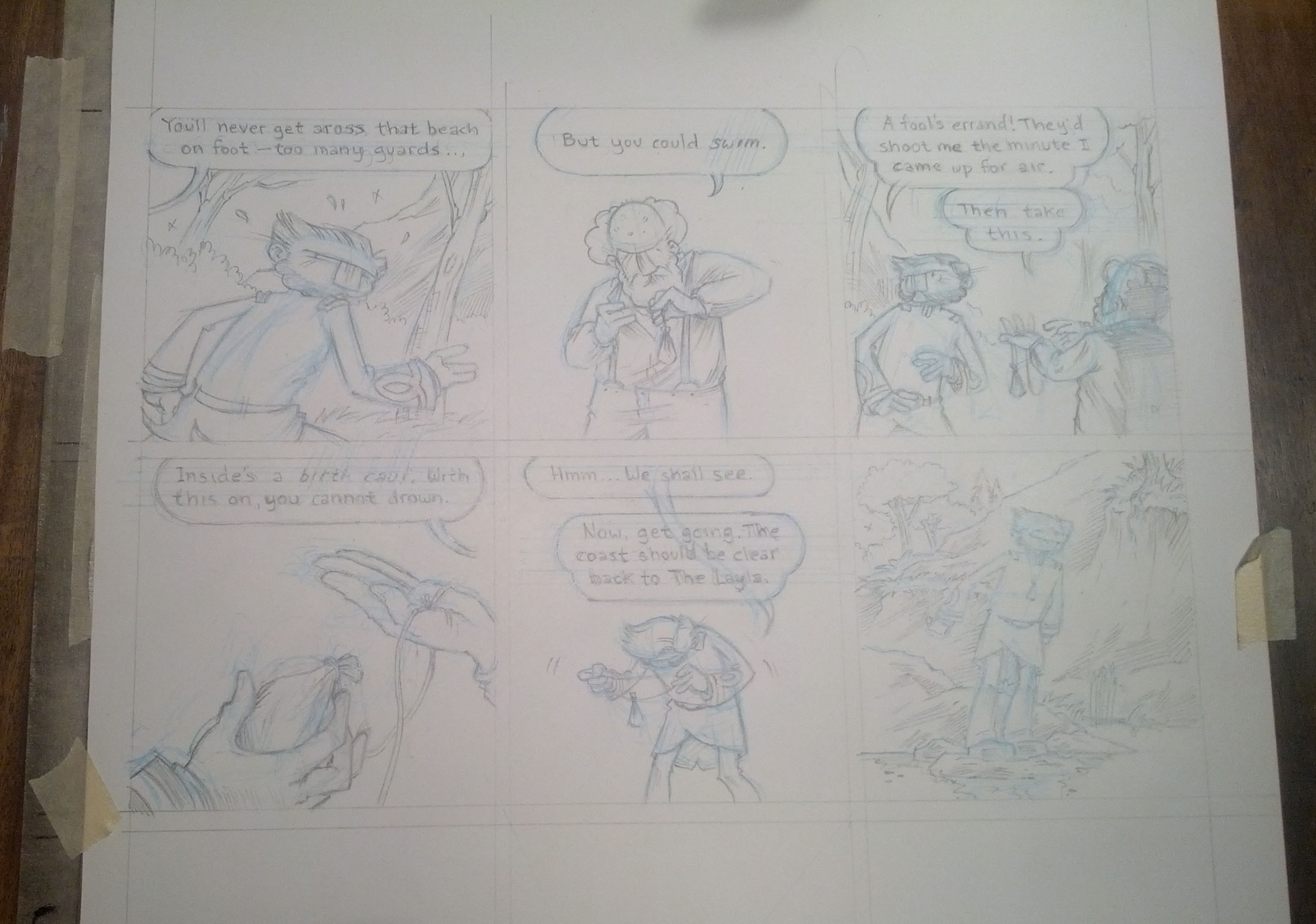 (On my drafting table, Jan 1, 2014: half-penciled Oyster War page 110.)