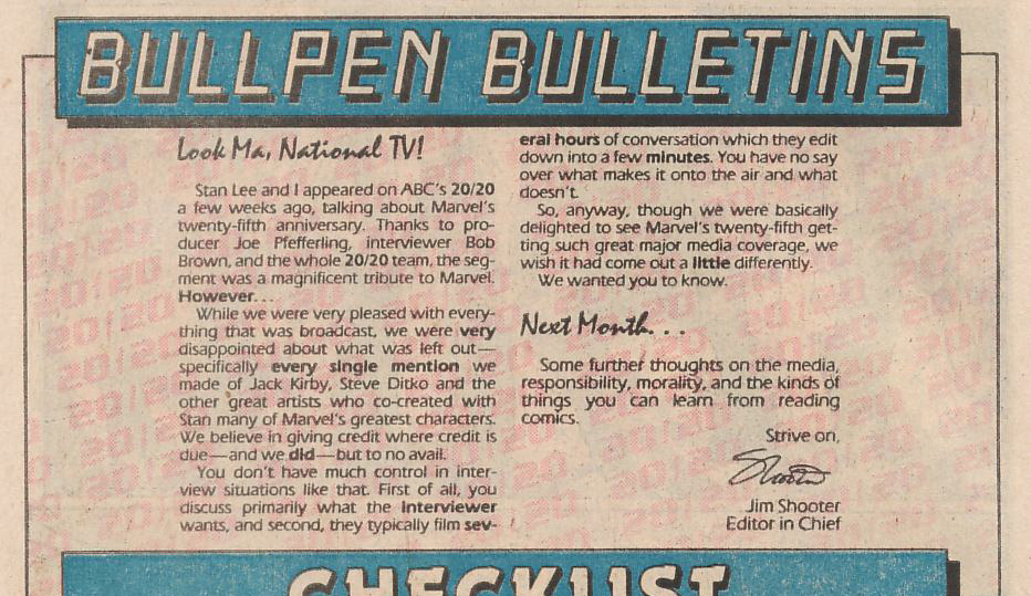 I was surprised to see the term “co-creator” used so matter-of-factly here… and kind of surprised to see this subject addressed at all, as there’s a long history, even in 1987, of articles and other puff pieces on Marvel that either implicitly or directly claim that Stan Lee “created” the characters that he in fact co-created with folks like Jack Kirby and Steve Ditko. You can still find the 20/20 segment on Marvel’s 25th anniversary that Shooter is addressing:
