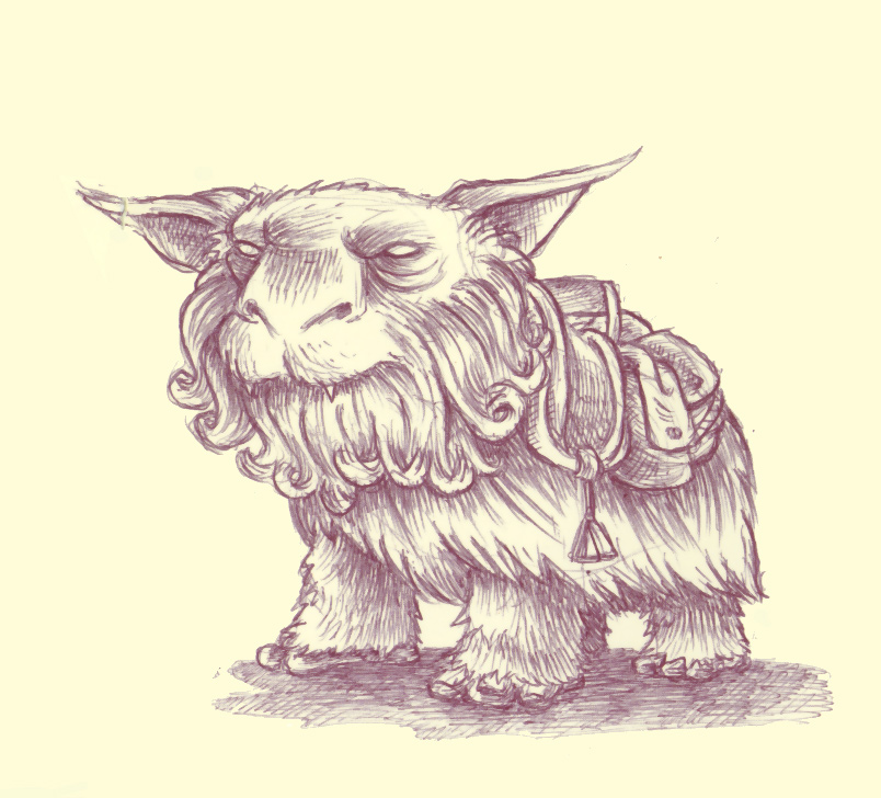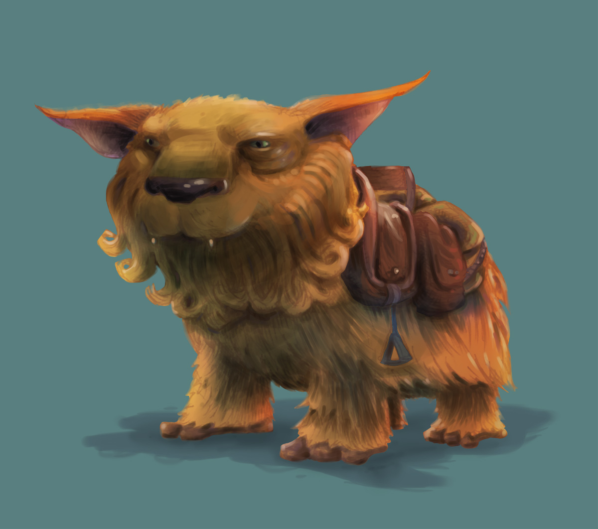 The next–and most difficult for me personally–assignment was doing a more traditional digital painting, rendering form with brushes rather than doing a detailed value drawing first and then applying layers with blending modes. I found this old ballpoint pen drawing of a fantasy battle beast/pack animal and did a painting based on that. Again, this is a version revised based on feedback from the instructor: