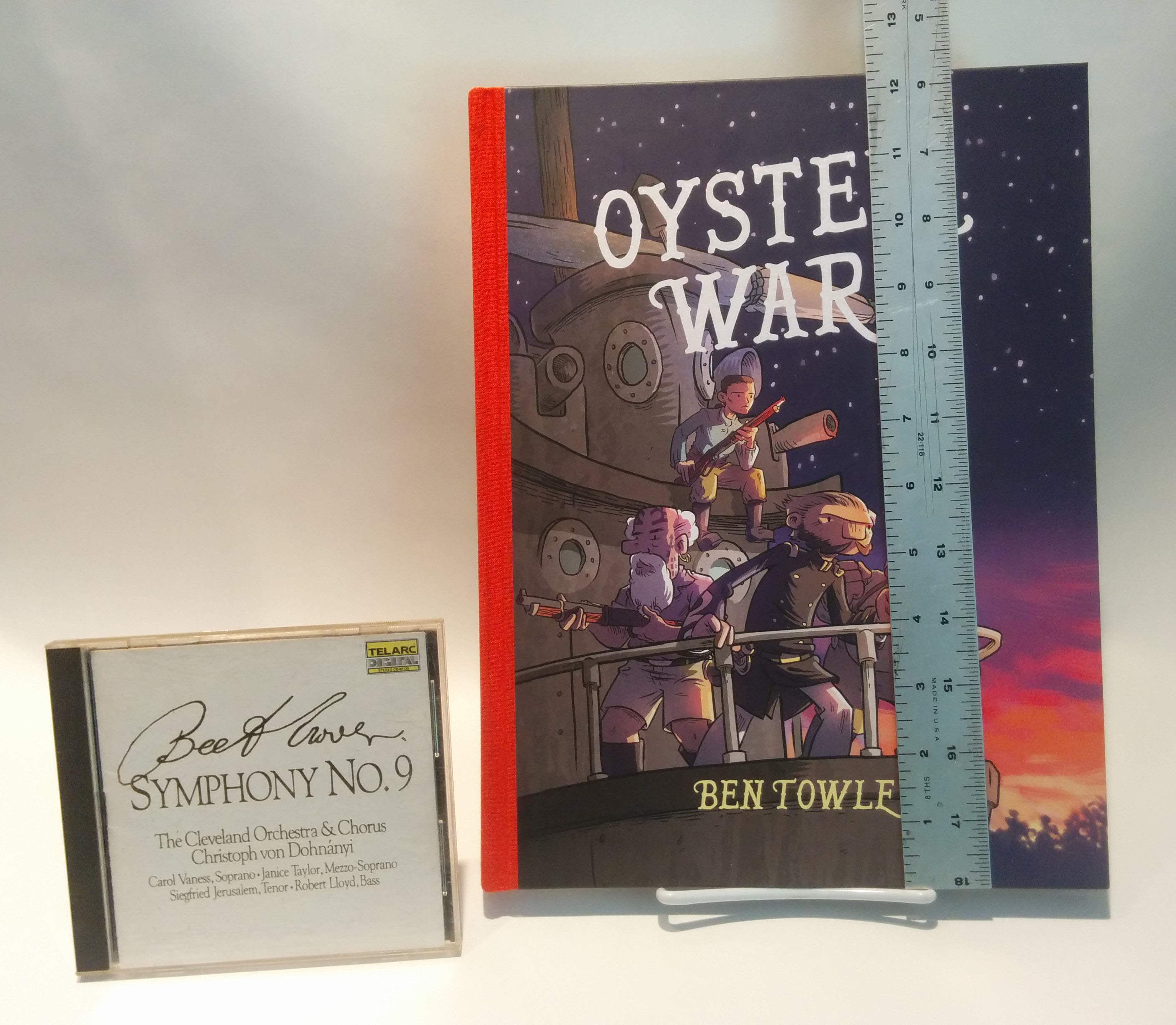 I just received this sample copy of Oyster War and it looks great! Here’s a few pictures of the book, including one with a CD and ruler so you can get an idea of how big this book is. I’m really happy with the way the printing turned out. Look for the book in stores this Fall from Oni Press. The in-store date is in flux at the moment due to some printing delays, but I’ll continue to keep my “Oyster Tour” schedule/appearances post updated as the dates get worked out.