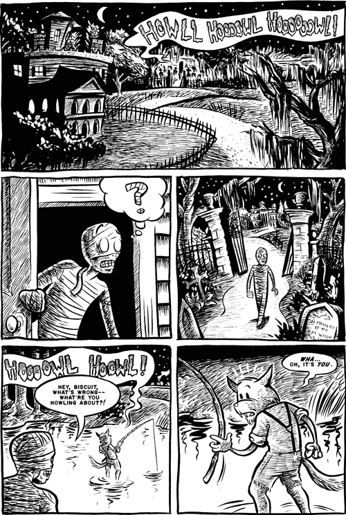 In stores now is Haunted Mansion #5, featuring stories by Dan Vado, Devon Devereaux, Drew Rausch, Jon “Bean” Hastings, Mike Moss and yours truly. My story is about “Biscuit,” the Cajun werewolf who lives among the ghosts at the haunted mansion. I posted a page from the story a way back, but here it is again: