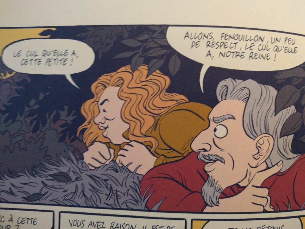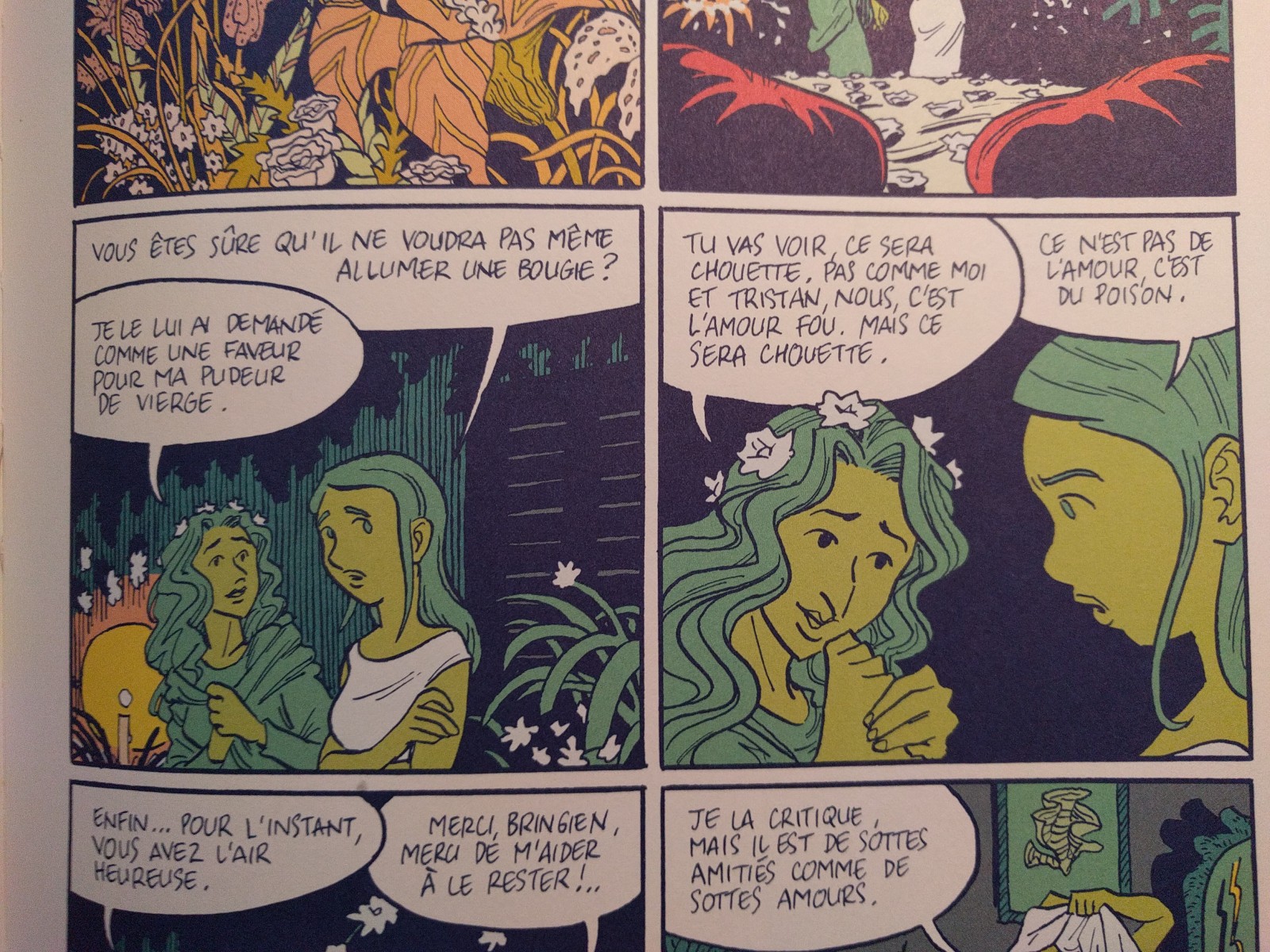 And speaking of French, a few notes on language for anyone considering reading this: My French, such as it is, is pretty bad (a generous assessment). I have to have a French dictionary at hand and Google Translate open on my phone to get through much of anything. That said, the French in Tristan & Yseult isn’t too complex. As you can see in the sample panels I posted, the volume of text per panel is reasonable (aside from one big splash page toward the end that’s all text). There are also relatively few weird idomatic expressions in the book–and the ones that were there I was able to figure out relatively easy via Google or by asking about it on Twitter. There are a few instances of wordplay–such as when some courtesans are making cow/animal allusions about Yseult–that I struggled with a bit, but generally most of the French can be popped into Translate as a last resort and will yield something vaguely coherent. Oh, and also: for some reason they talk a lot about butts in the book, so you’ll learn two or three different French words for butts, butt cheeks, etc. Bonus!