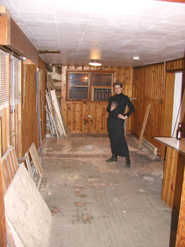 Major renovation work began today on an upstairs room of “The Crackhouse.” Pictured below is its state as of yesterday. Already completed when the picture was taken are: the removal of several layers of floor-coverings (plywood, linoleum, more linoleum, even more linoleum), dismantling of the kitchen area on the far wall, roughing in of plumbing for future laundry room.