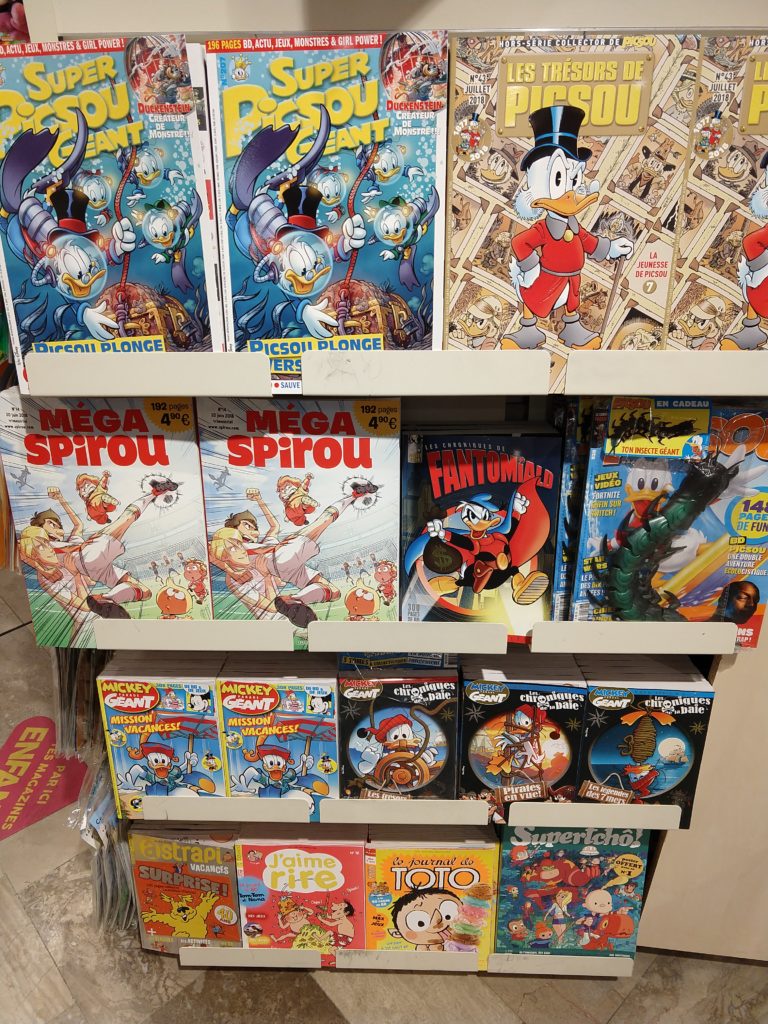 The Hugo Pratt exhibit was held at the Musée des Confluences in Lyon, three hundred miles south of Paris. Thanks, though, to France’s wonderful high-speed train system, that’s just a day trip! I took an early train out of Paris and was in Lyon in around two hours. While at the station I spotted this rack of kids’ comics in one of the shops: