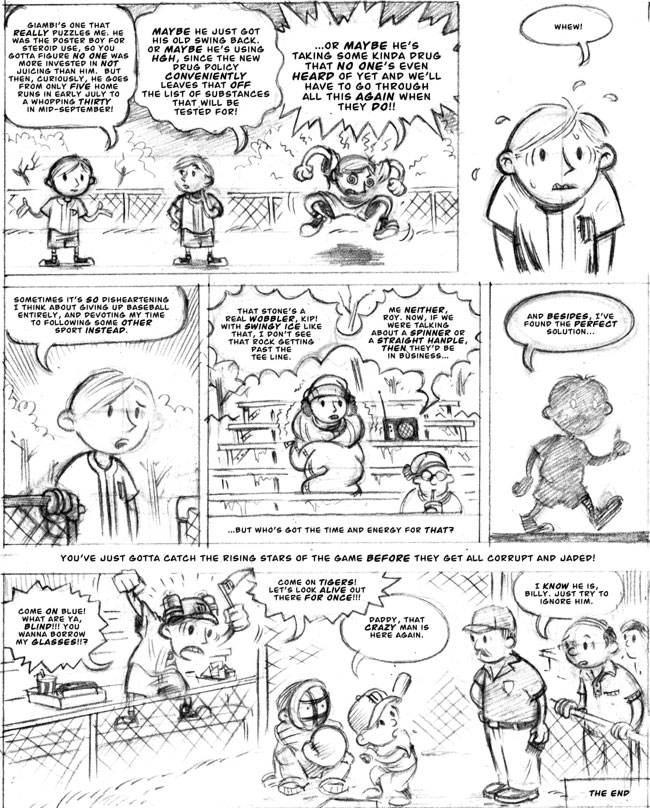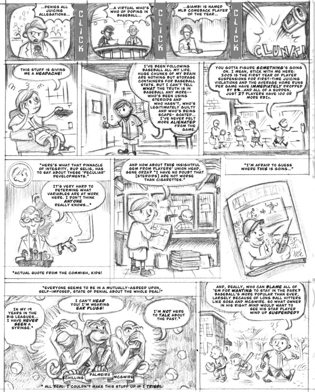 One thing I stumbled across that I had almost forgotten about were the originals for this two page story about baseball that I’d been hired to do by GQ Magazine in 2005. The strip was intended to appear in the magazine’s 2005 year-end roundup issue, but got first pushed to a possible spring issue (to coincide with the start of spring training), then was ultimately killed before it got to the ink and color stage, and never appeared in print.