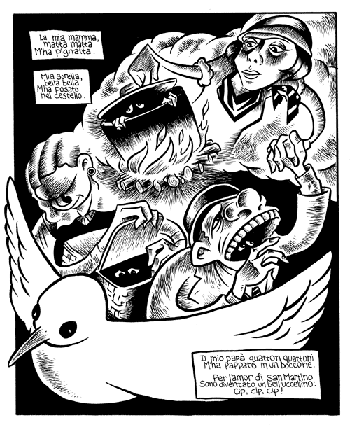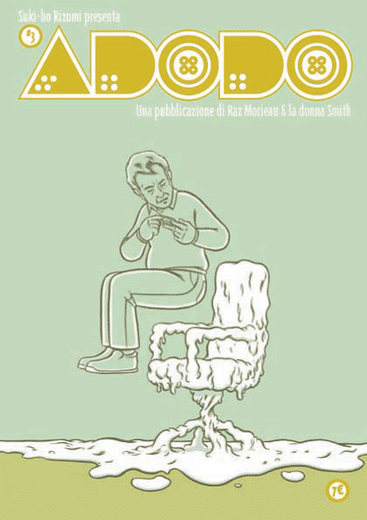 “Adodo is in Italian, and contains mostly literature, but we cared a lot about the visuals. There’s a story from James Kochalka, titled ‘Rootbeeer. ‘ There’s a story without words by Ivan Brunetti. There are three drawings of Peter Kuper. Three drawings of William Schaff. A few illustrations by Carrie McNinch. Six strips from the City by Derf. And other drawings and illustrations by Italian artists. And of course, your illustration…”