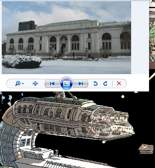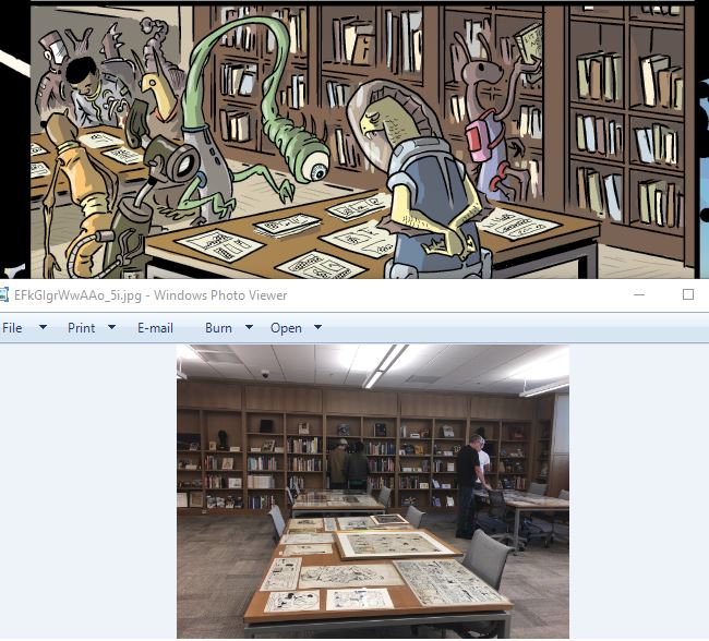 … and its cutaway view is the Billy Ireland’s reading room where you can look at any of their 300K-ish originals, as these folks in the poster are doing: