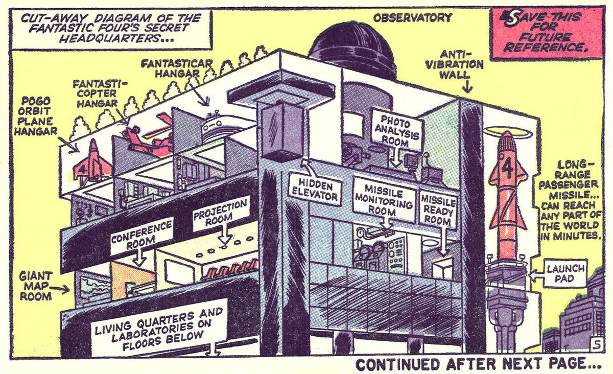 It dawned on me as I was putting my class presentation together that I should figure out a way to incorporate a cutaway into this year’s poster design, and thus I immediately switched gears and begin working up a design based on some kind of cutaway. I would think back to this moment many times as I spent hours and hours painstakingly rendering miniature interior spaces on the poster–“Why didn’t I just do the damn animal thing?!” Anyway, this was a great excuse to take a deep dive into comics’ wealth of amazing cutaway drawings. I rounded up tons of them, but here’s one of my favorites: The Fantastic Four’s Baxter Building: