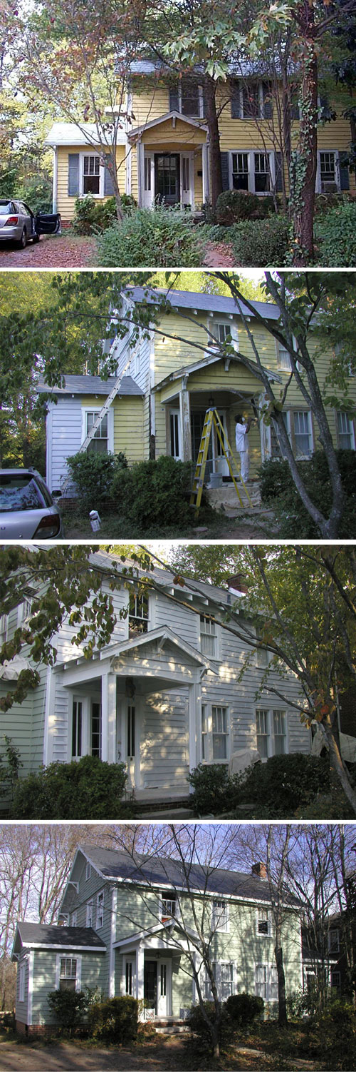 “Miracle” is probably too strong a word, and of course it’s more of a catastrophe as far as our finances are concerned, but the exterior of “The Crackhouse” has finally been repainted. The top image of its original state doesn’t really do justice to how dilapidated the paint was. Our next-door neighbor told us that the yellow paint was in-place when she moved to the neighborhood… in 1976.