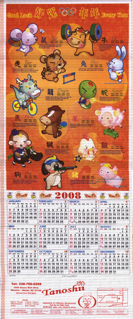In addition to the usual holiday treats like seeing friends and family, good food and general good cheer, folks in Winston-Salem have another thing we look forward to each holiday season: the Tanoshii Chinese restaurant’s annual calendar.