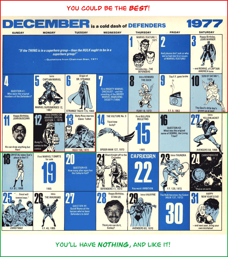For a visual aid, please refer to this page showing December from the 1977 Marvel calender. Once you’re done reminiscing about the marriage of Betty Ross and Glenn Talbot, (Hulk #158, natch!) note that there are still over two weeks left in 2007. What if Grant Morrison and Alan Moore had been secretly collaborating on comic illustrated by Chris Ware, Roger Langridge and the ghost of George Herriman, huh? And what if that book were coming out tomorrow?! You know it would be the best thing not just this year, but ever! Where would your fancy-pants list be then, TIME Magazine–WHERE??!!!