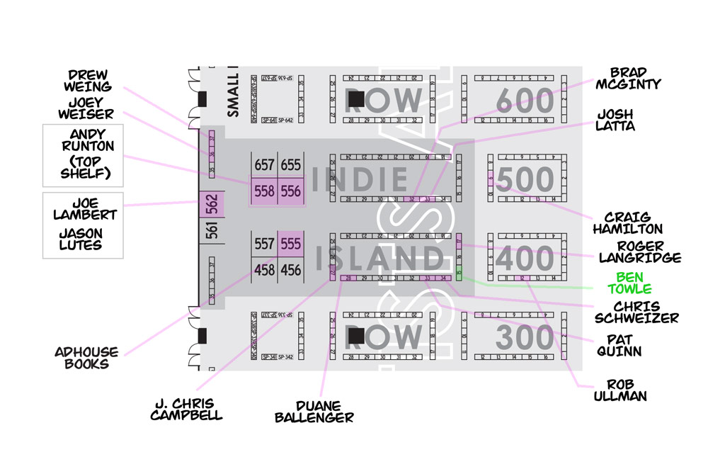 Seating assignments for the upcoming heroes con are now posted. In order to actually find people, though, you have to cross-reference the table number of each person with the PDF map of the hall on the site. To make things simpler, here’s a handy chart showing the Indie Island area of the floor and I …